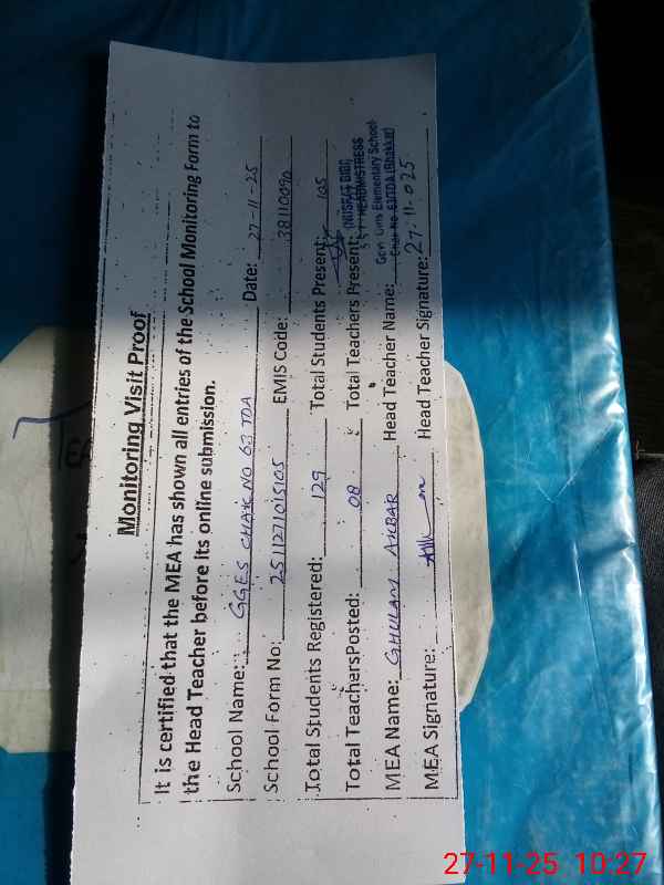 | Monitoring Date: 27-11-2025 | Start Time: 27-11-2025 10:00 AM | End Time: 27-11-2025 10:27 AM | Name of MEA: Gh**** Ak**** Kh**** | |