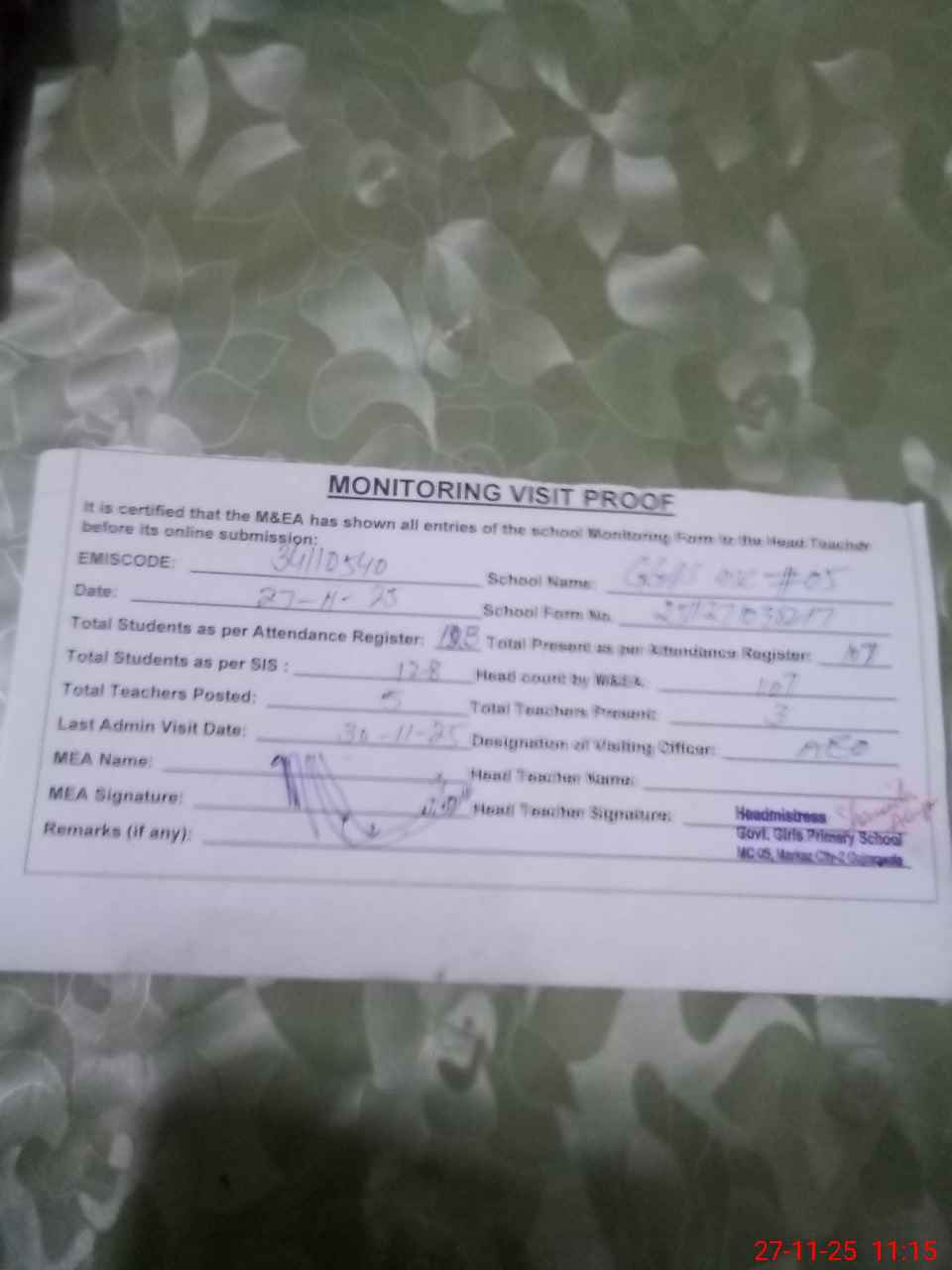 | Attendance Register | Head Teacher | MEA with School | Visit Proof |