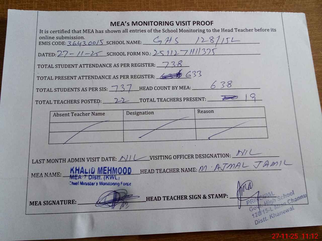 | EMIS Code: 36430015 | Name of School: GHS 128/15-L, MIAN CHANNU | |||