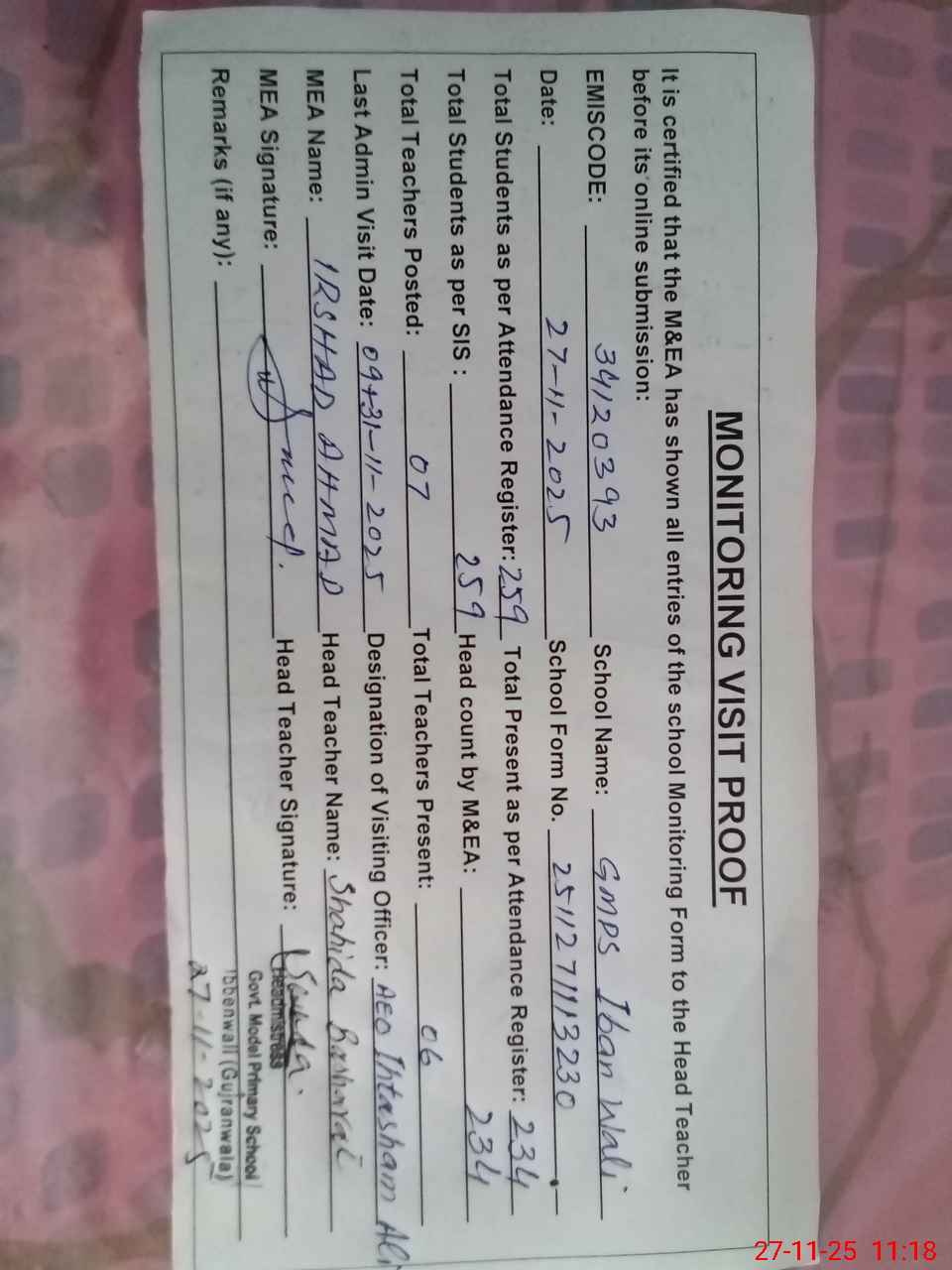 | Attendance Register | Head Teacher | MEA with School | Visit Proof |