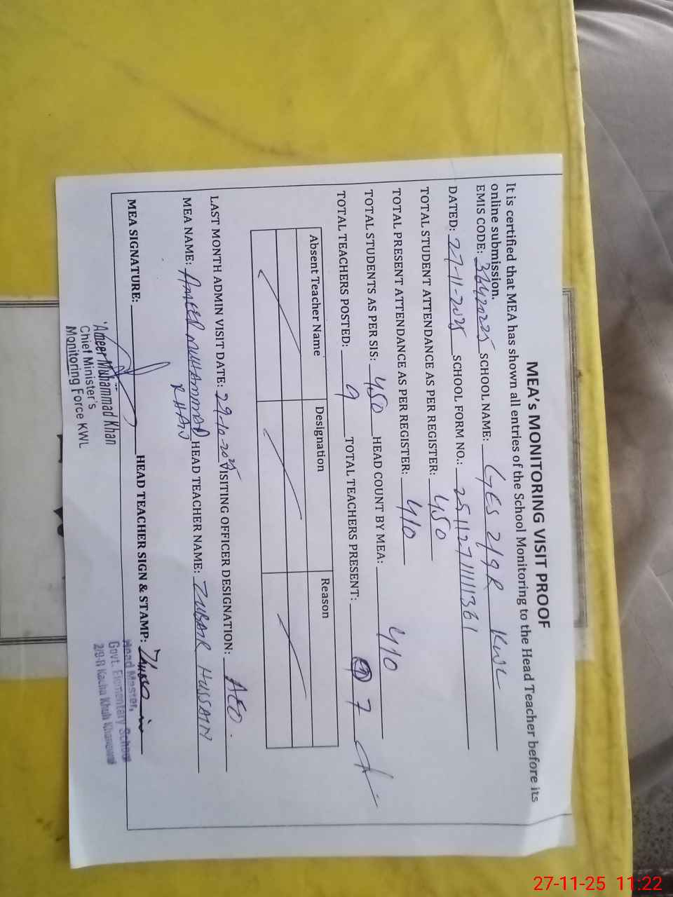 | Attendance Register | Head Teacher | MEA with School | Visit Proof |
