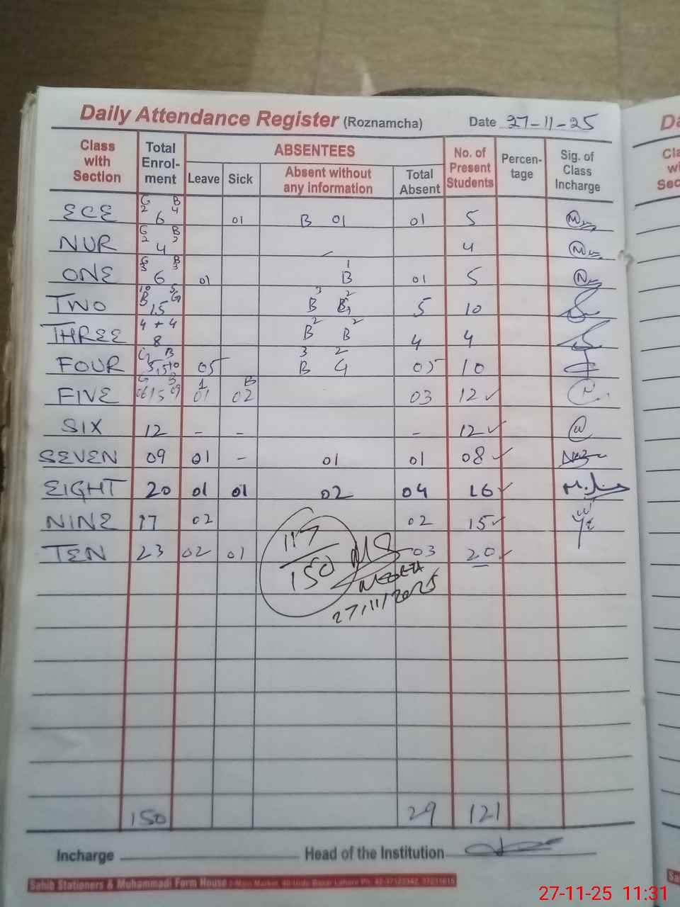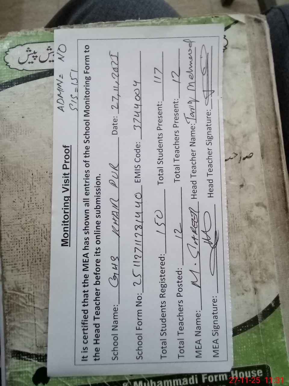 | Attendance Register | Head Teacher | MEA with School | Visit Proof |