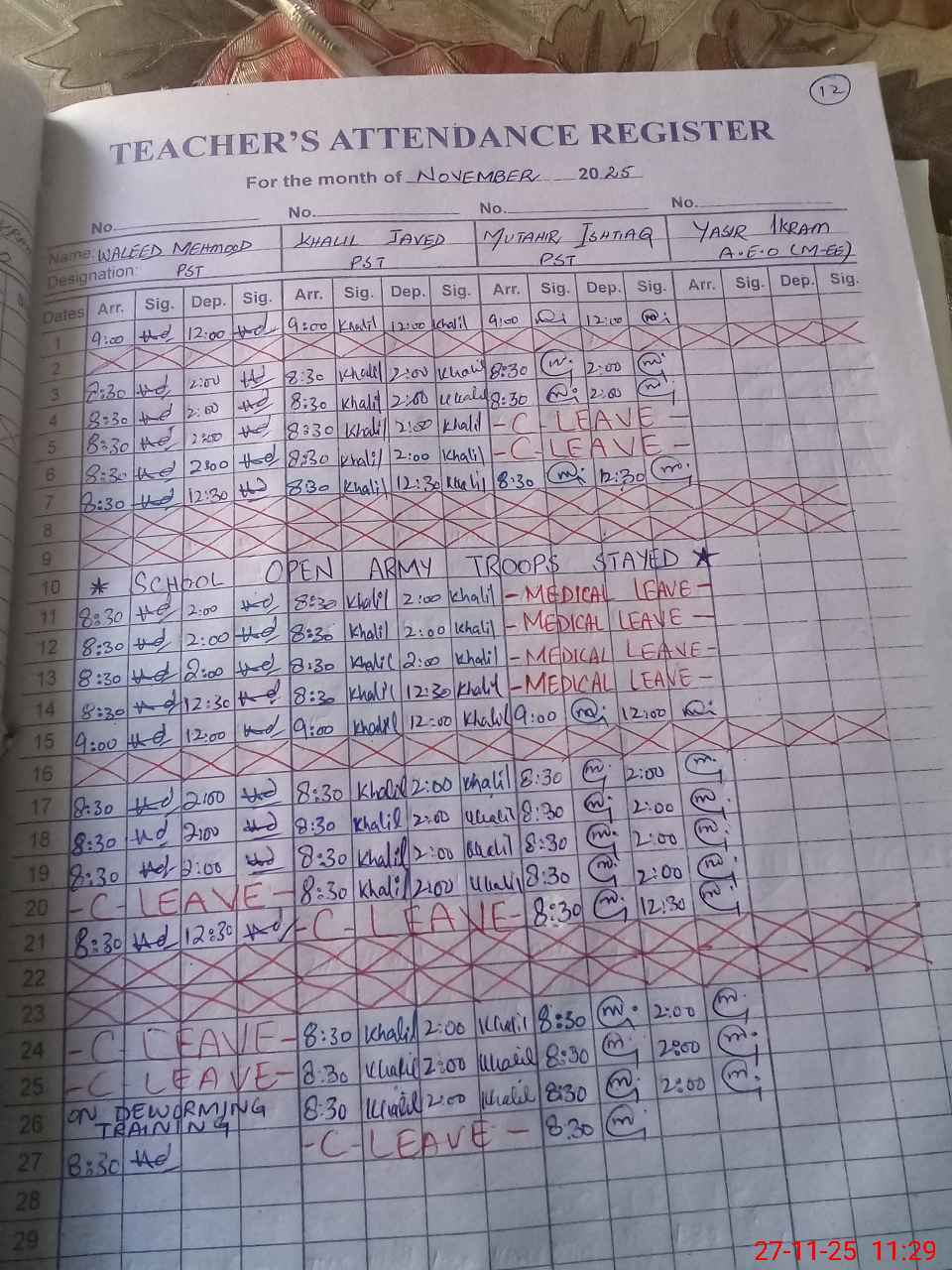 | CNIC | Full Name | Designation | R/C | Absence During Last Calender Month |