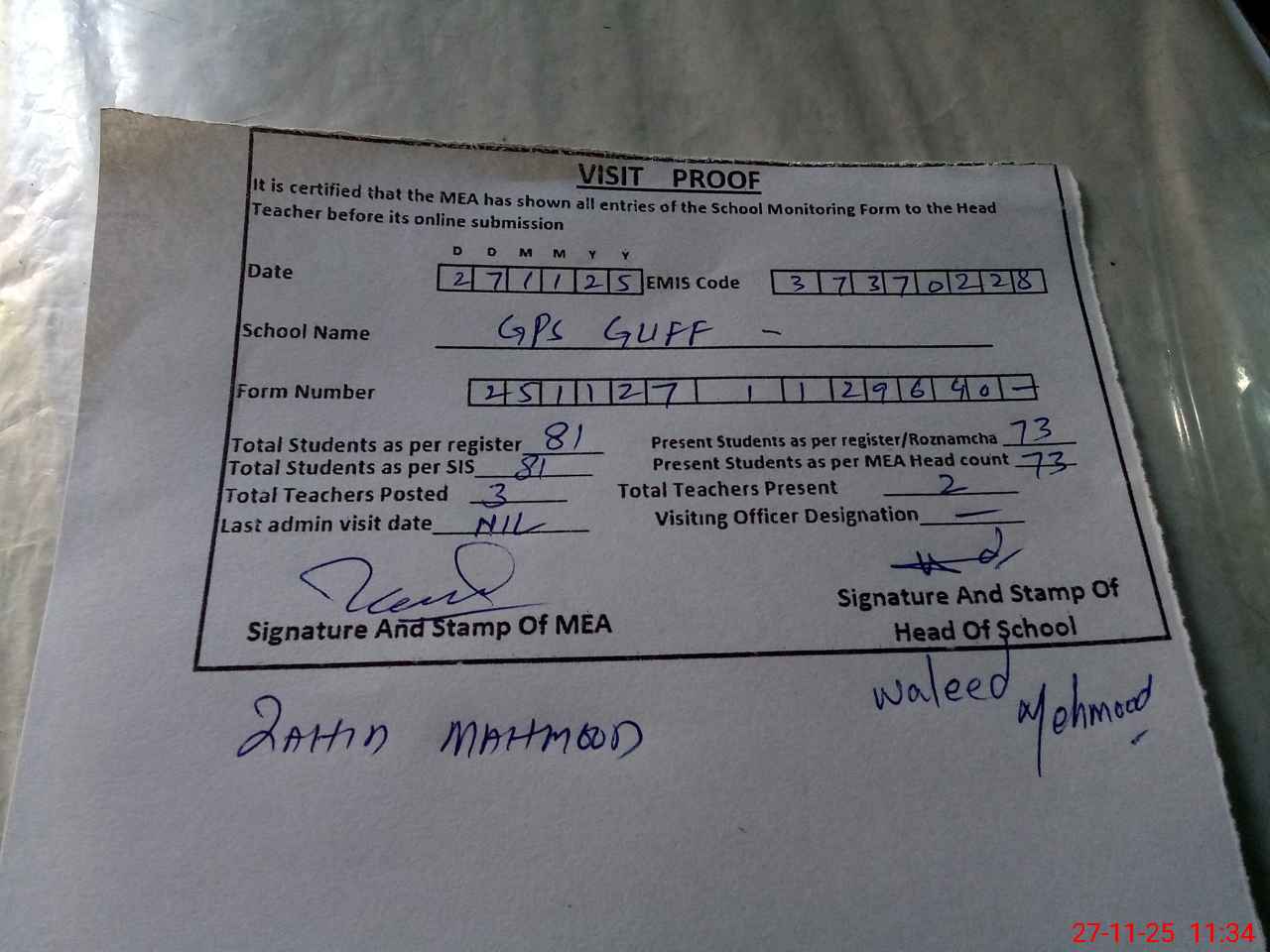 | Attendance Register | Head Teacher | MEA with School | Visit Proof |
