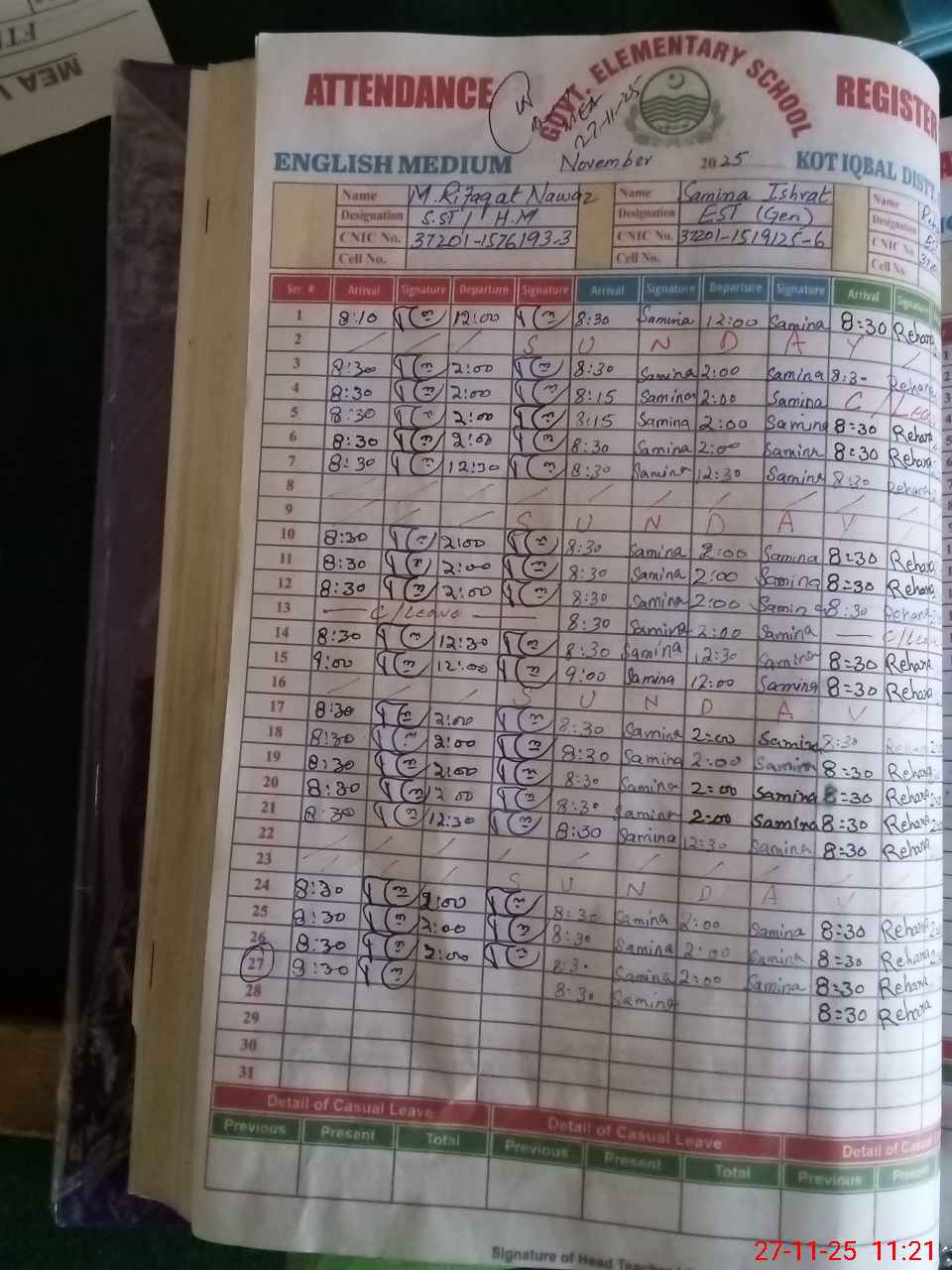 | CNIC | Full Name | Designation | R/C | Absence During Last Calender Month |
