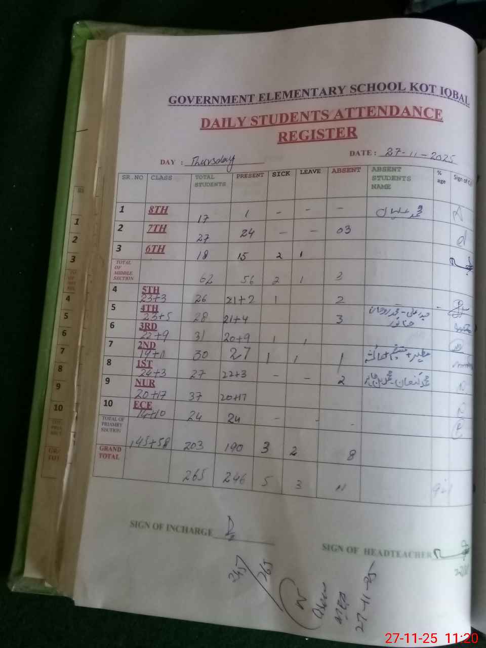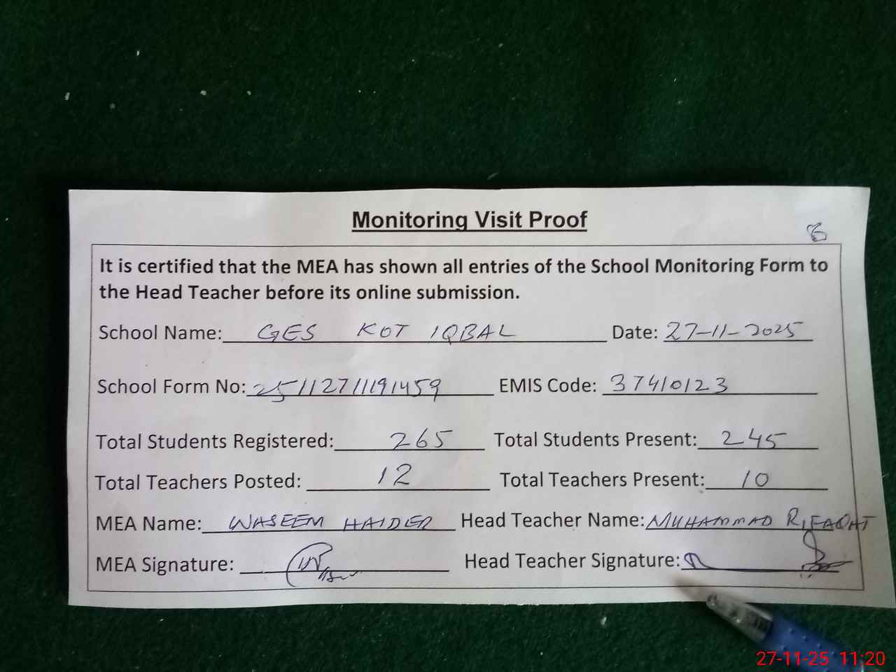 | Attendance Register | Head Teacher | MEA with School | Visit Proof |