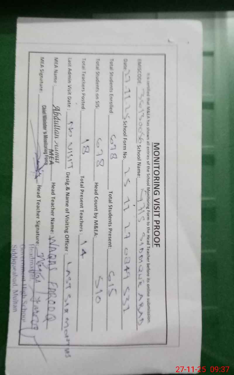 | EMIS Code: 36130056 | Name of School: GHS BASTI SIDDIQUE ABAD (NIHALAY WALA) MULTAN | |||