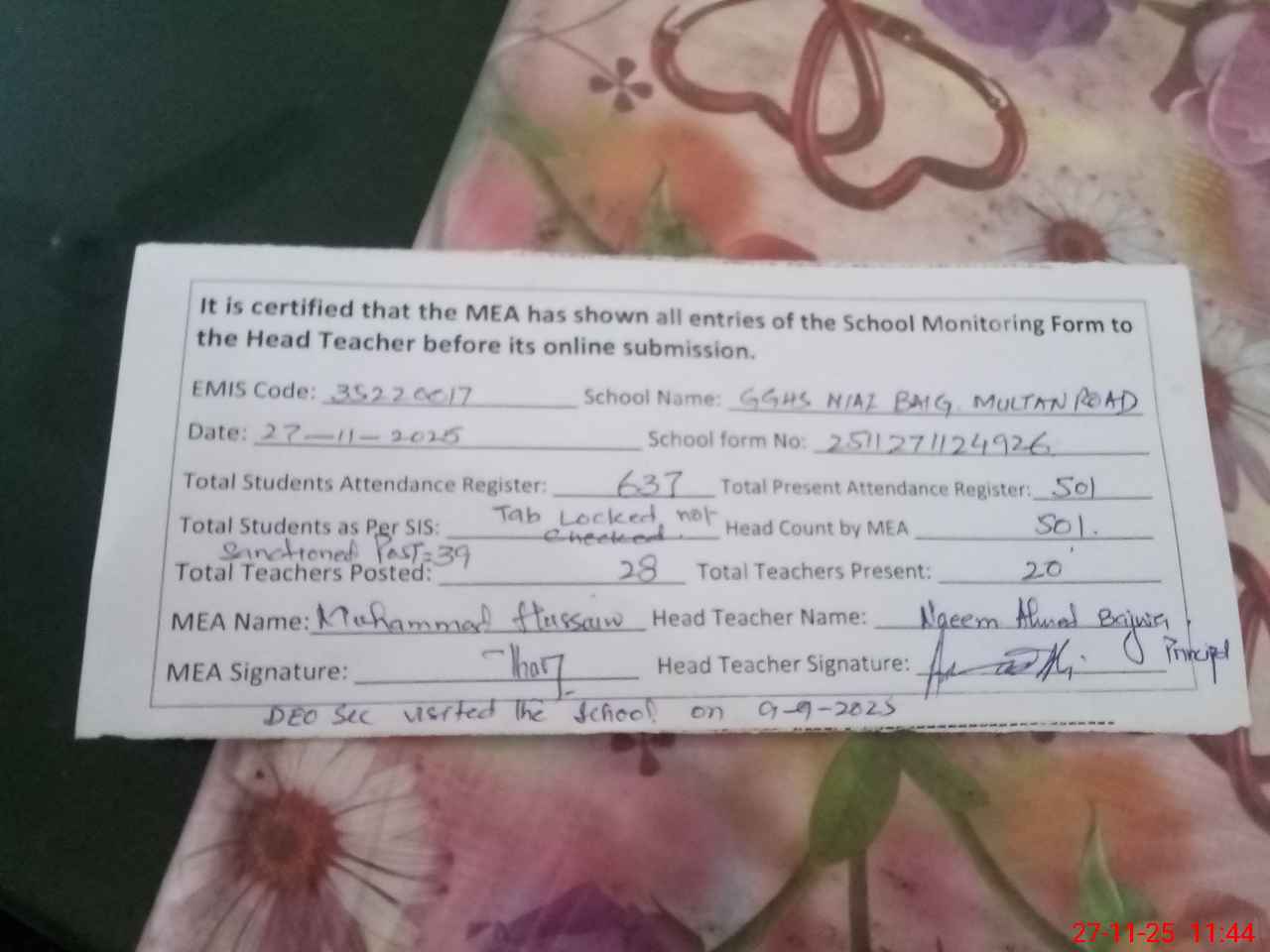 | EMIS Code: 35220017 | Name of School: GHSS NIAZ BEG, MULTAN ROAD | |||