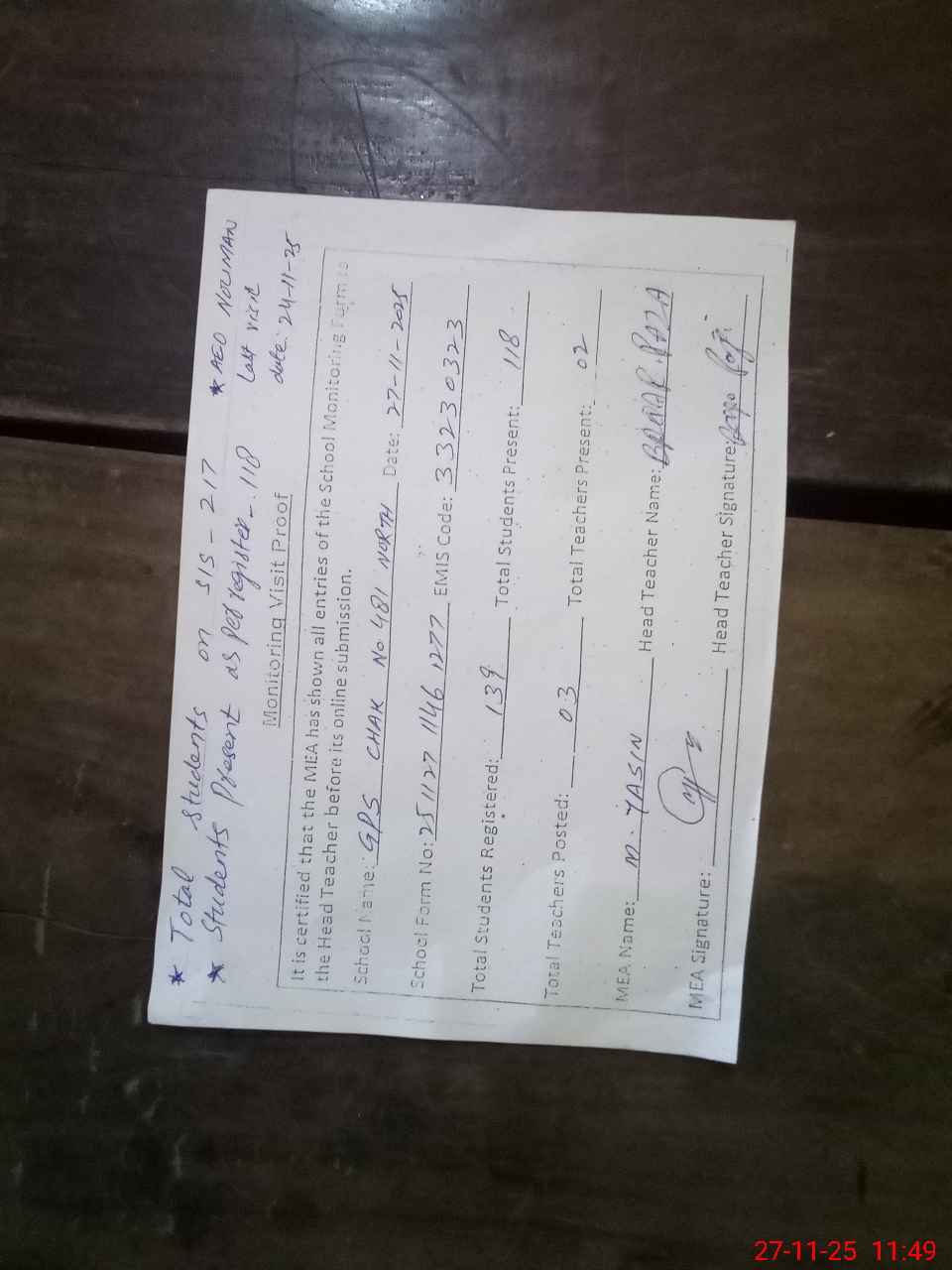 | Attendance Register | Head Teacher | MEA with School | Visit Proof |