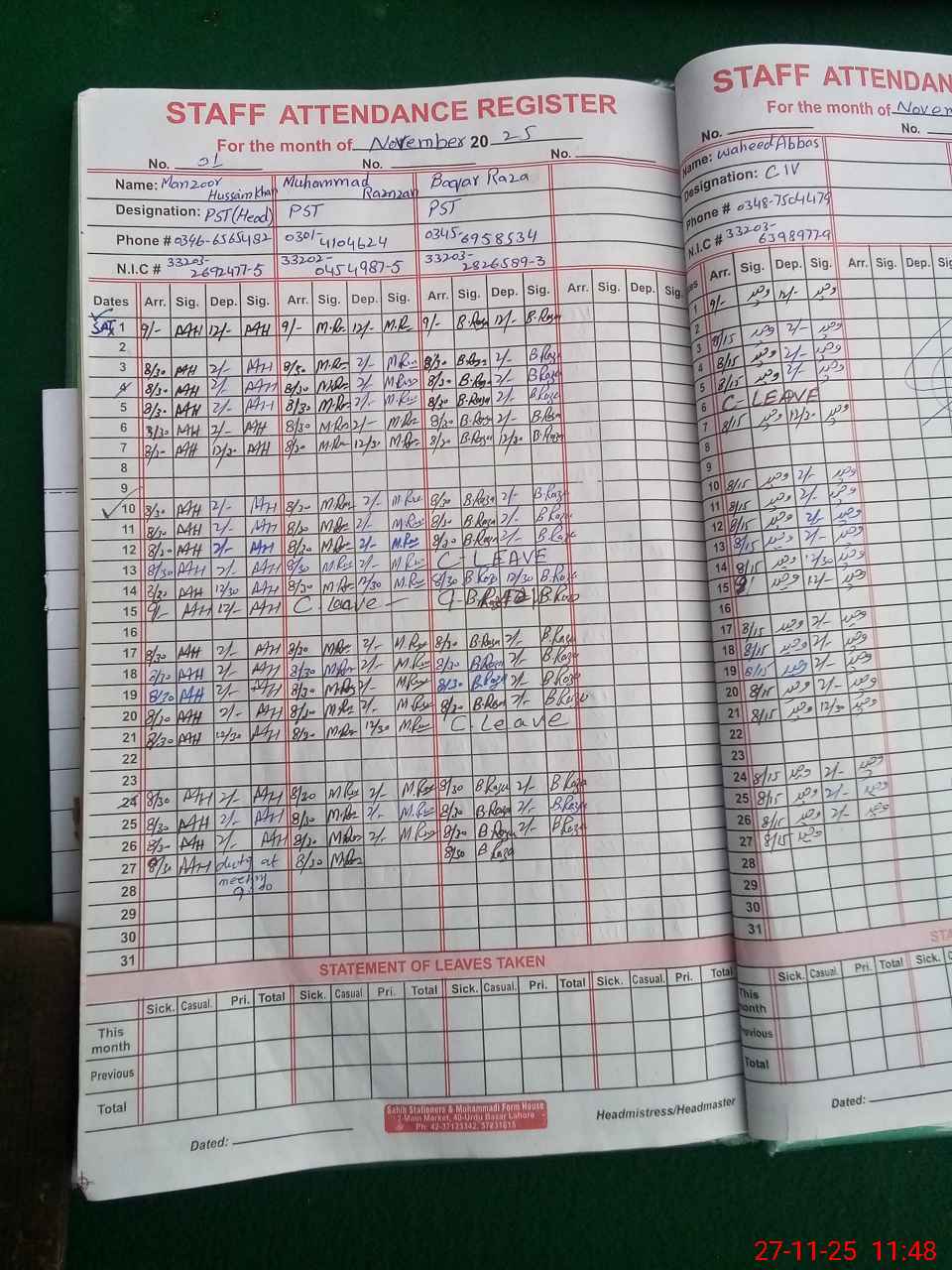 | CNIC | Full Name | Designation | R/C | Absence During Last Calender Month |