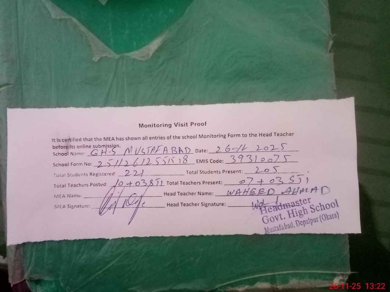 | Attendance Register | Head Teacher | MEA with School | Visit Proof |