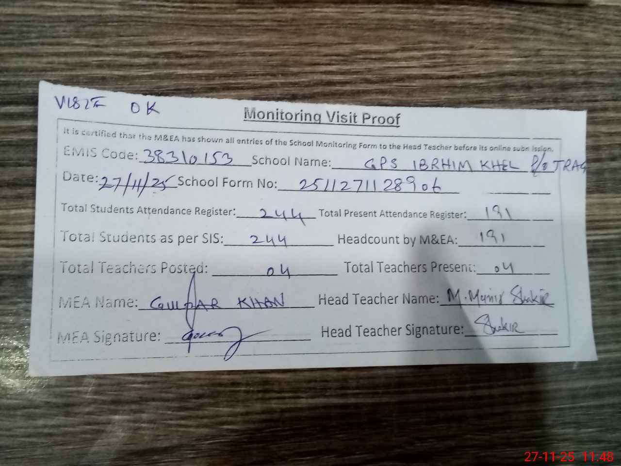 | Attendance Register | Head Teacher | MEA with School | Visit Proof |