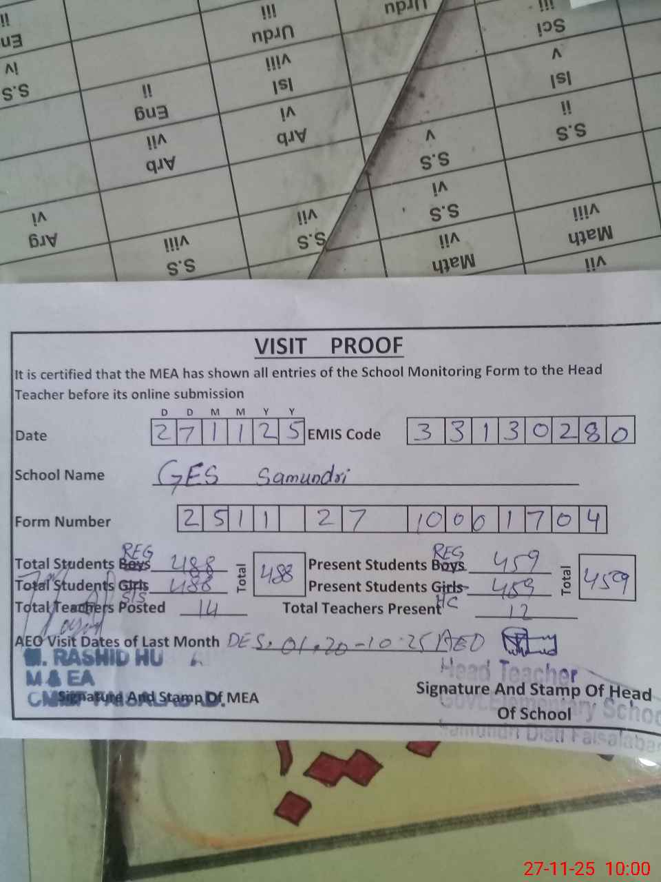 | Attendance Register | Head Teacher | MEA with School | Visit Proof |