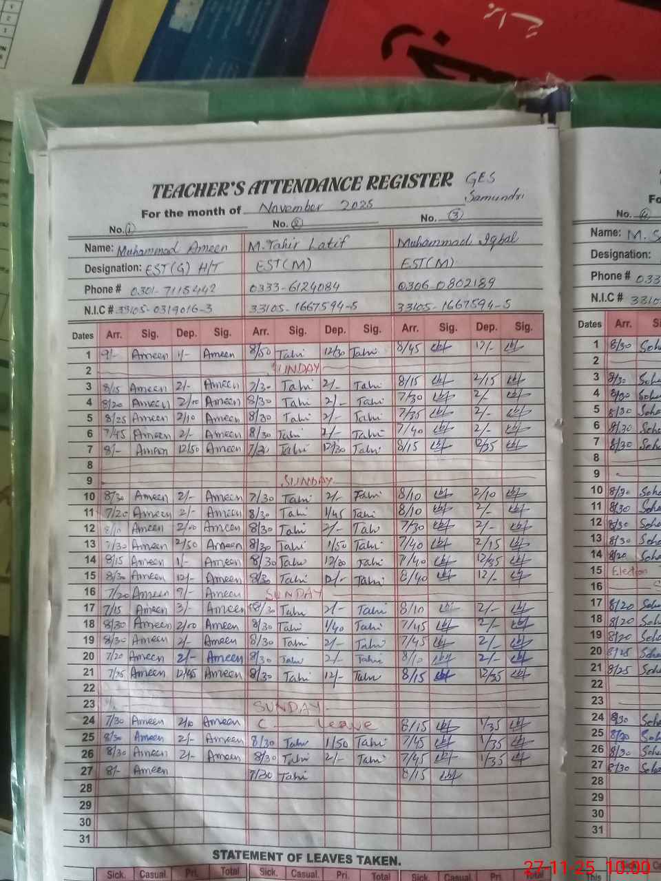 | CNIC | Full Name | Designation | R/C | Absence During Last Calender Month |