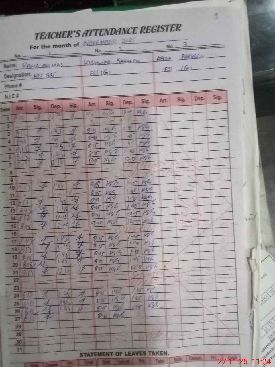 | CNIC | Full Name | Designation | R/C | Absence During Last Calender Month |