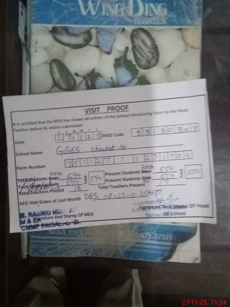 | Attendance Register | Head Teacher | MEA with School | Visit Proof |