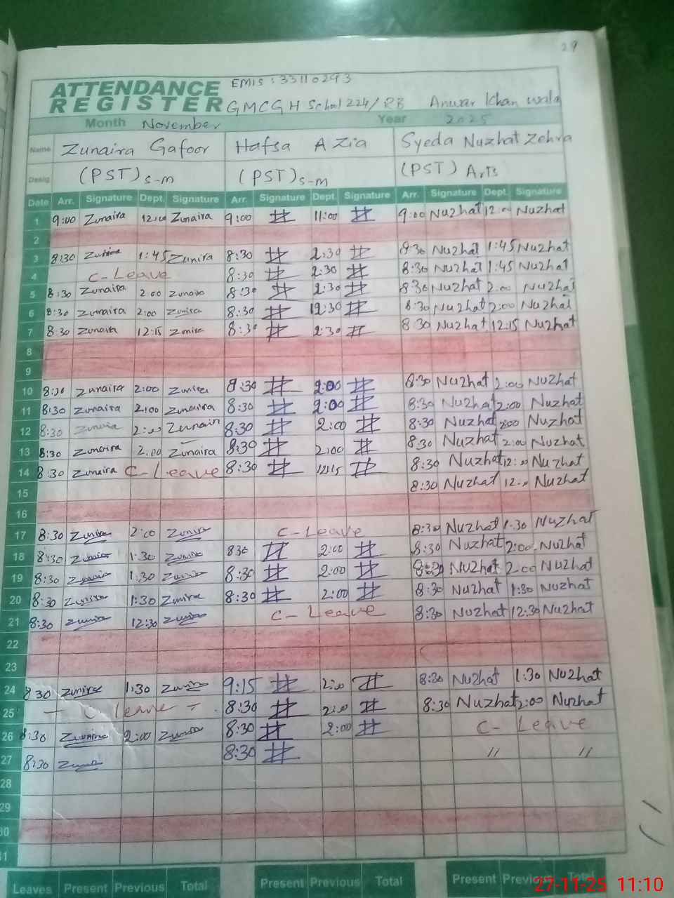 | CNIC | Full Name | Designation | R/C | Absence During Last Calender Month |