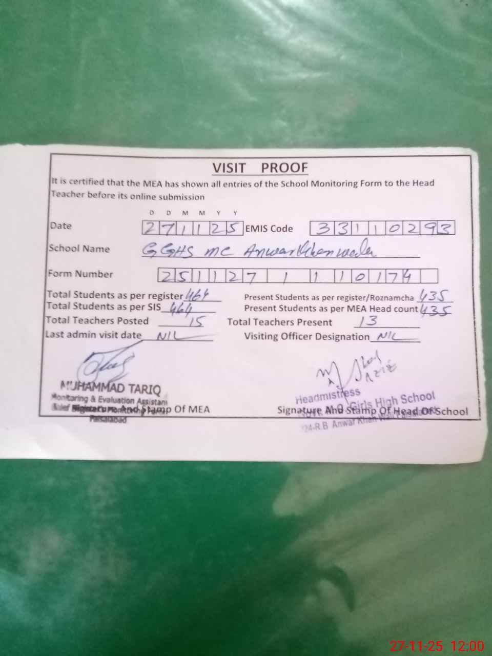 | Attendance Register | Head Teacher | MEA with School | Visit Proof |
