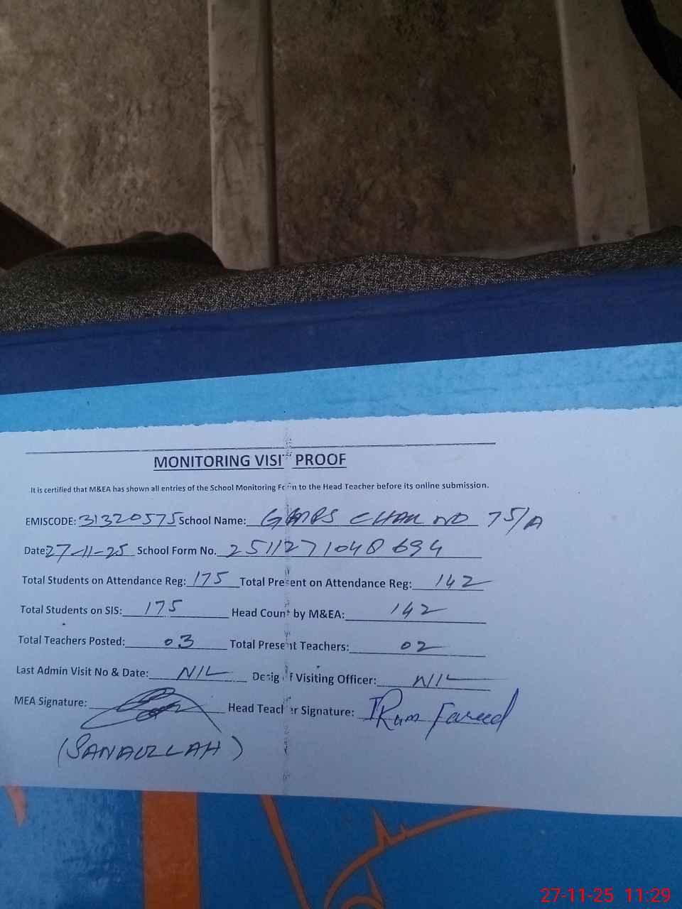 | Attendance Register | Head Teacher | MEA with School | Visit Proof |