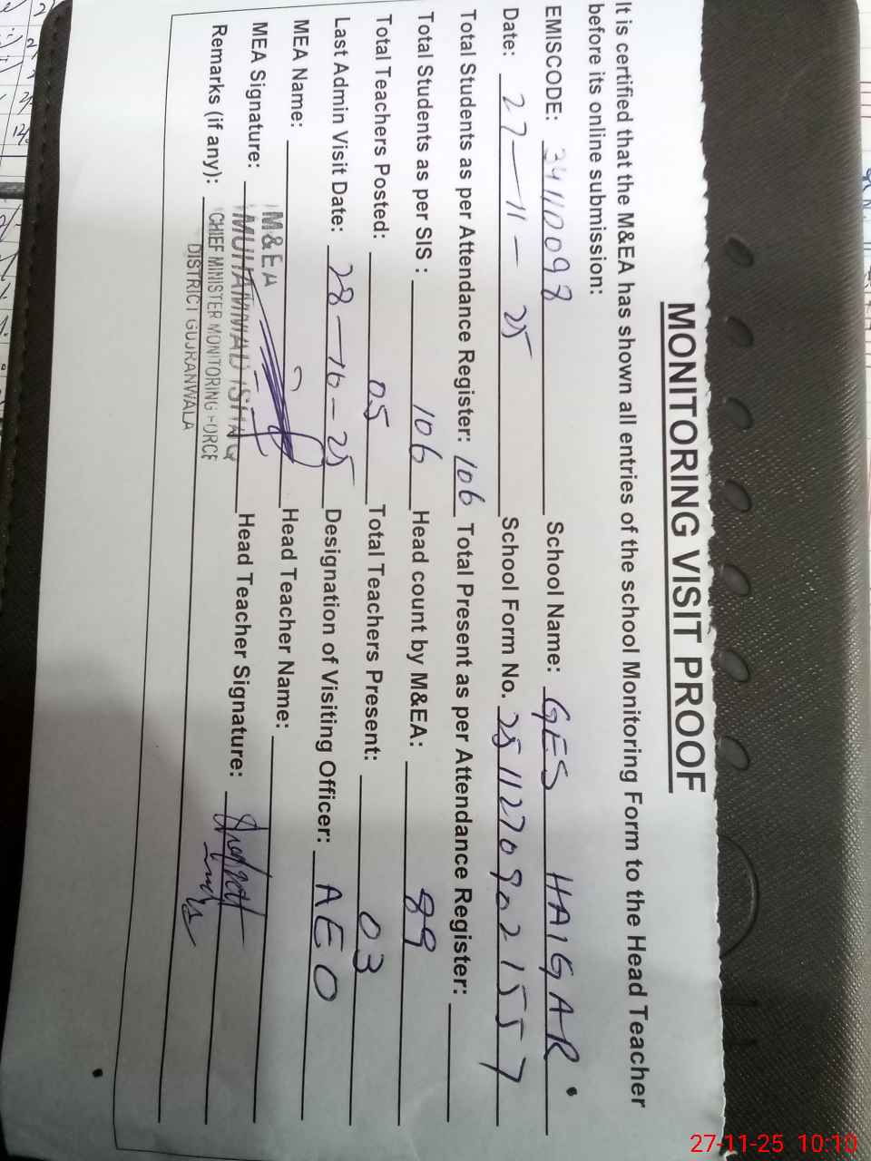| Attendance Register | Head Teacher | MEA with School | Visit Proof |