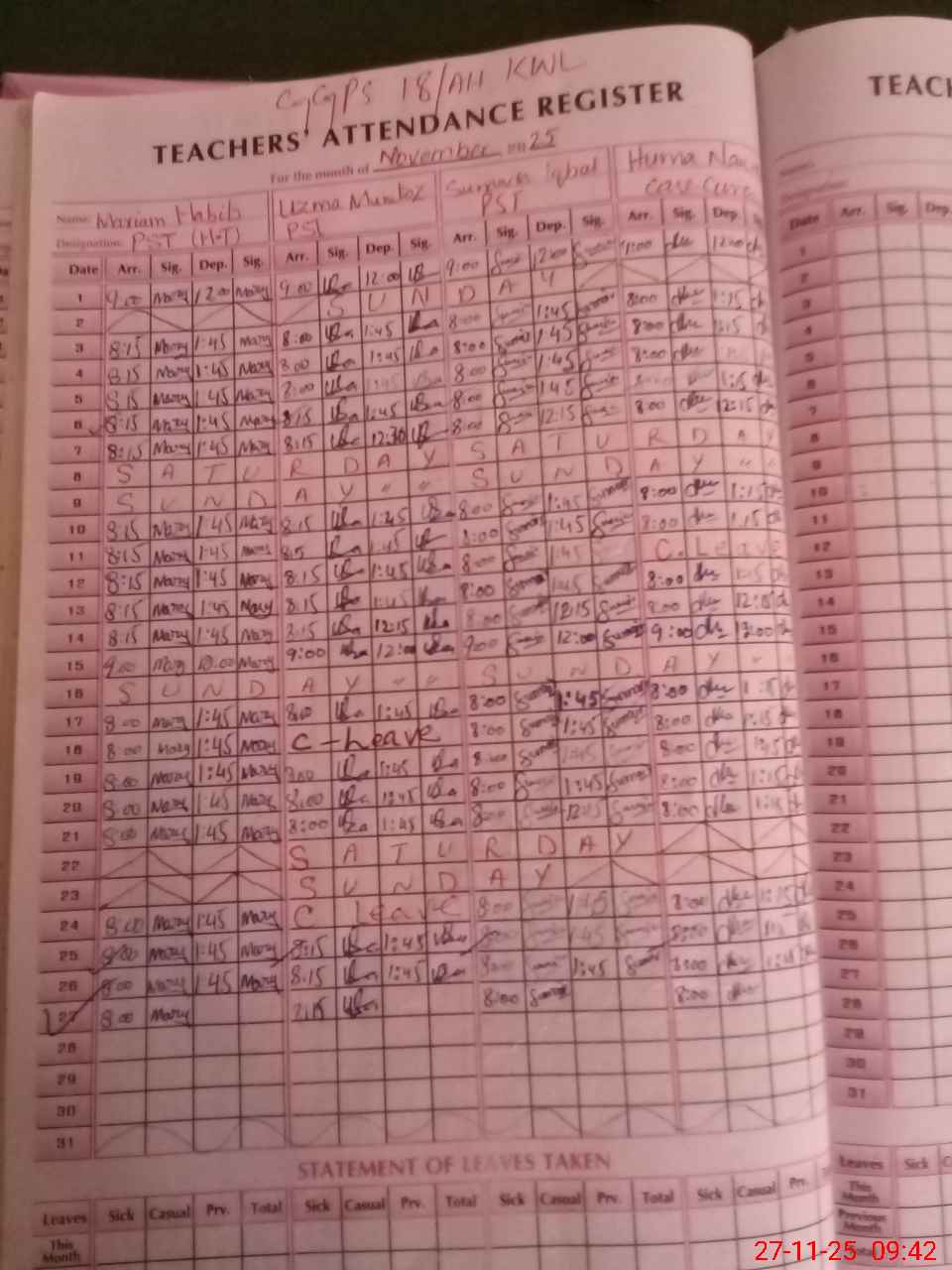 | Leave | Duty | Absent | Maternity | Medical | Ex- Pak |