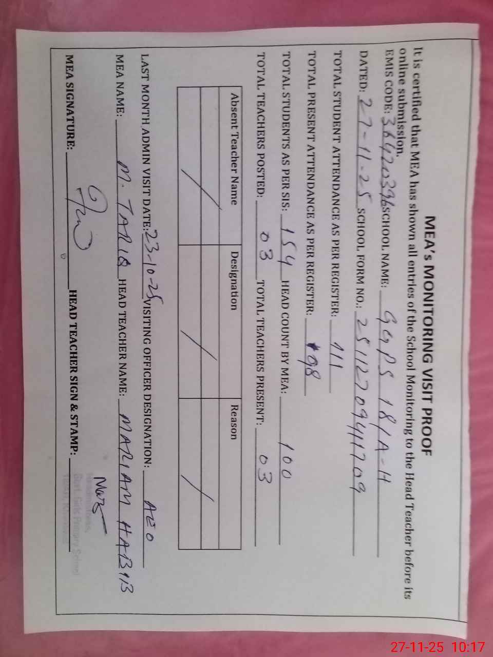 | Attendance Register | Head Teacher | MEA with School | Visit Proof |