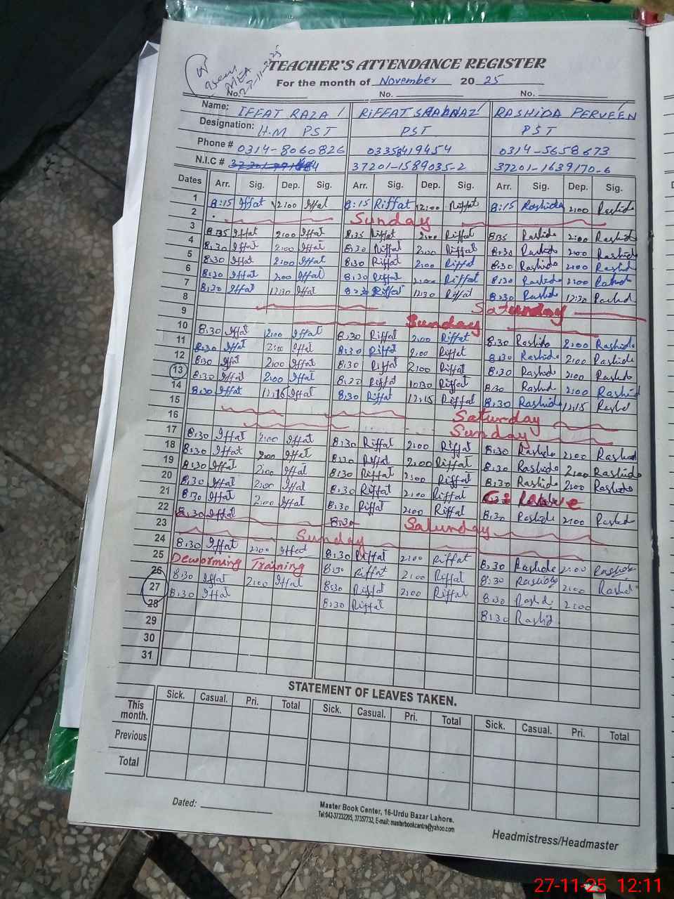| CNIC | Full Name | Designation | R/C | Absence During Last Calender Month |