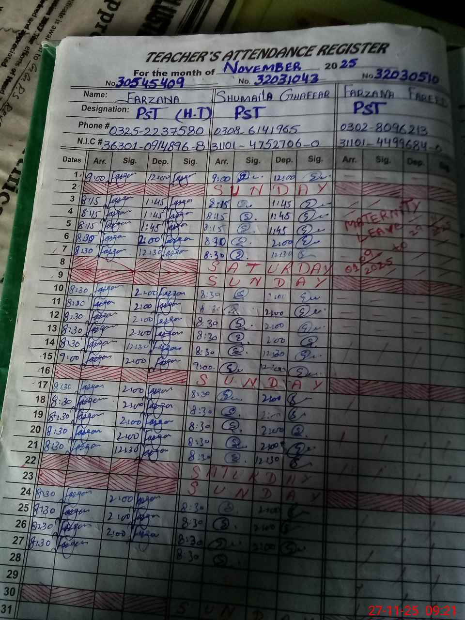 | CNIC | Full Name | Designation | R/C | Absence During Last Calender Month |