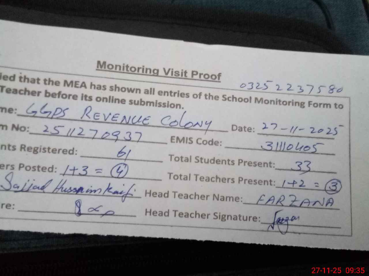 | Attendance Register | Head Teacher | MEA with School | Visit Proof |