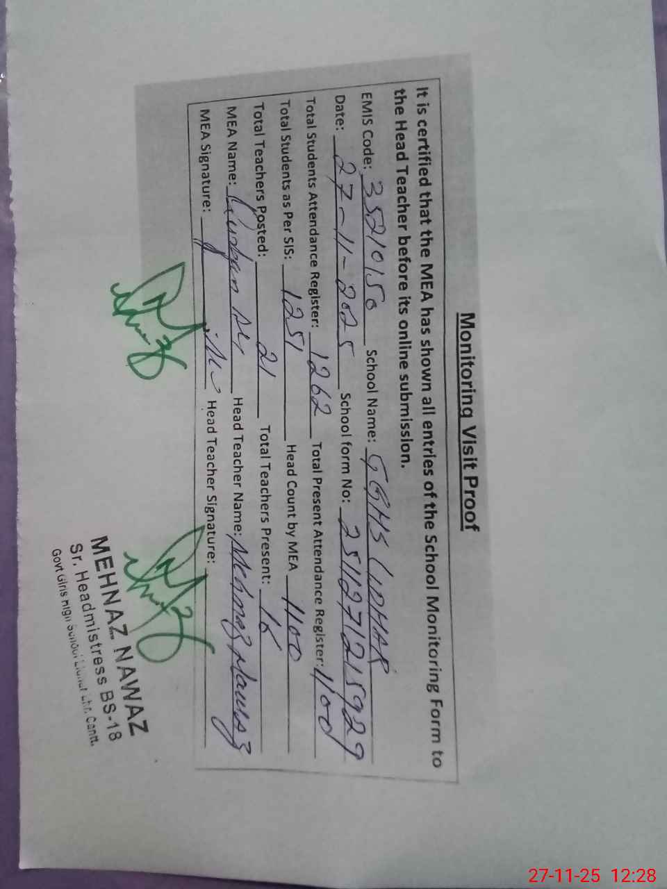 | Remarks (Use Separate Page if Required): Administrator visit of latest by Dy DEO on 7th August 2025 Administrator visit of latest by AEO on 27th October 2025 | |||||