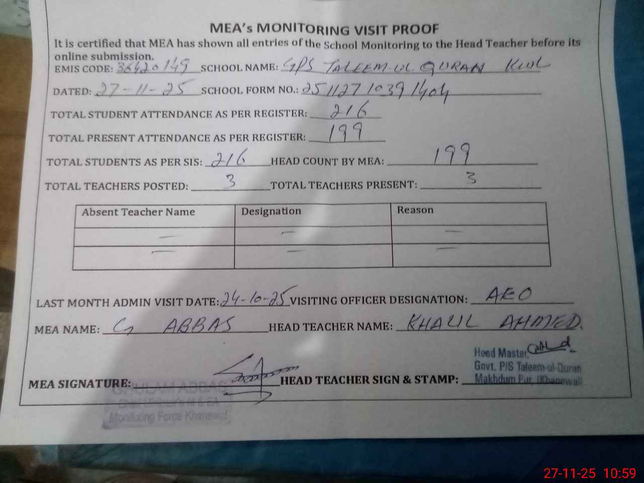 | EMIS Code: 36420149 | Name of School: GPS TALEEM UL QURAN, P/O MAKHDOOM PUR, KHANEWAL | |||