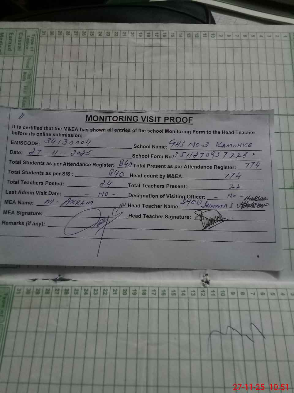| Monitoring Date: 27-11-2025 | Start Time: 27-11-2025 09:57 AM | End Time: 27-11-2025 10:54 AM | Name of MEA: K-**** Ak**** | |