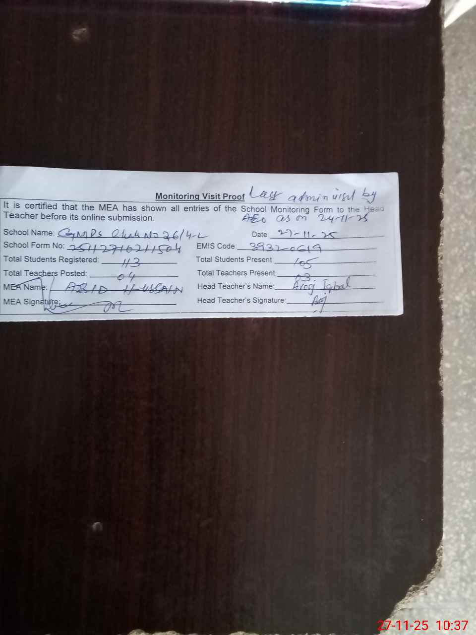 | Remarks (Use Separate Page if Required): Last Administrator visit by AEO as on 24-11-25. | |||||