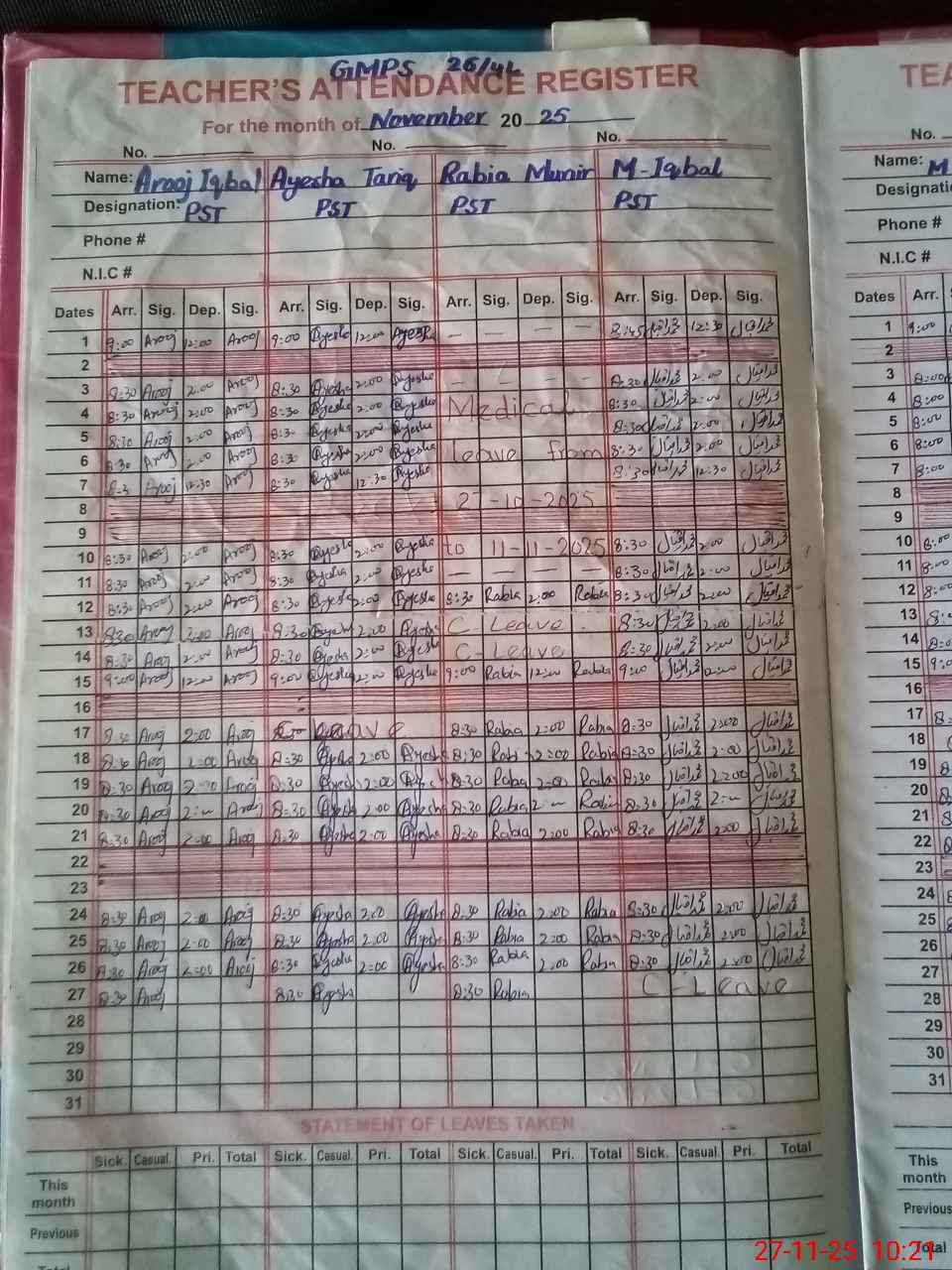| Leave | Duty | Absent | Maternity | Medical | Ex- Pak |
