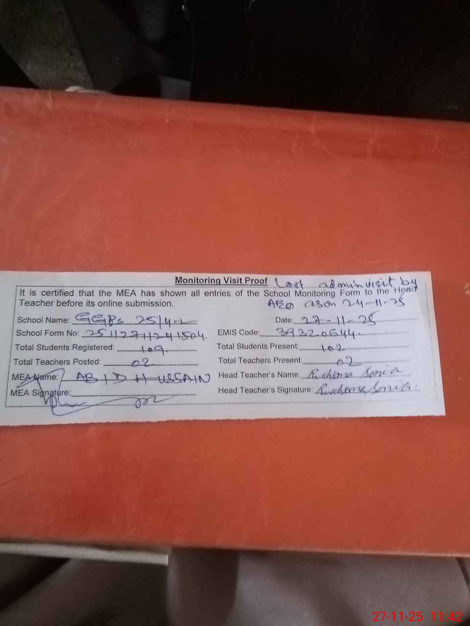 | Attendance Register | Head Teacher | MEA with School | Visit Proof |