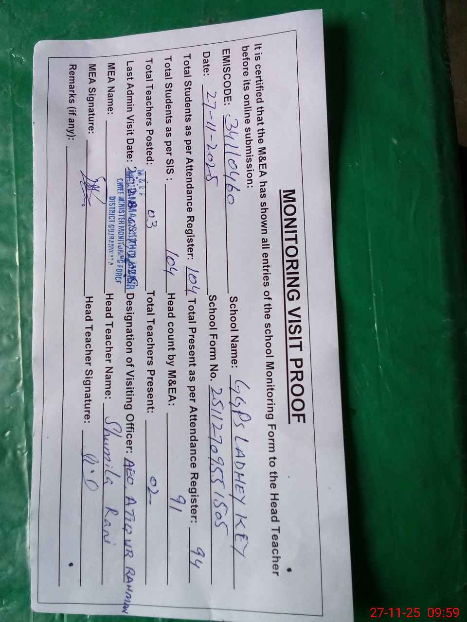 | Attendance Register | Head Teacher | MEA with School | Visit Proof |