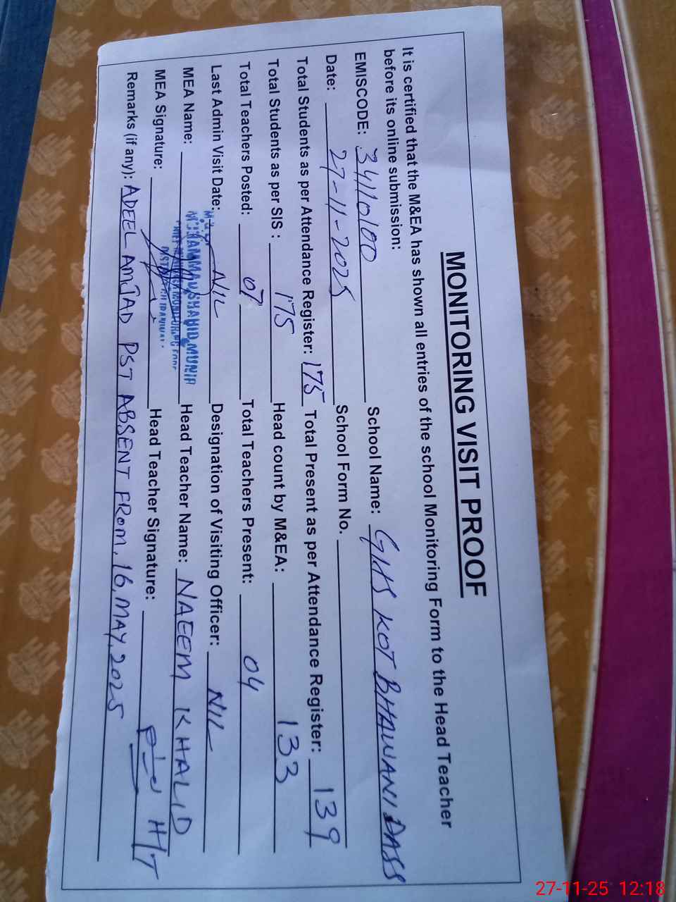 | EMIS Code: 34110100 | Name of School: GHS KOT BHAWANIDASS | |||