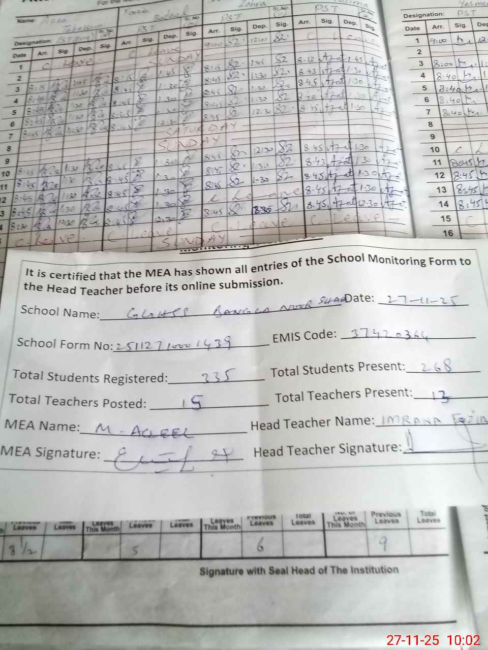 | Attendance Register | Head Teacher | MEA with School | Visit Proof |