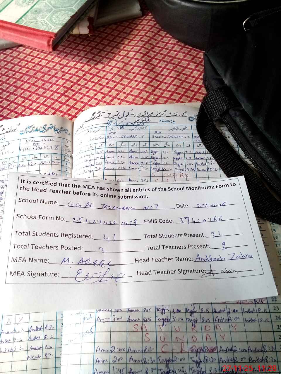| Attendance Register | Head Teacher | MEA with School | Visit Proof |