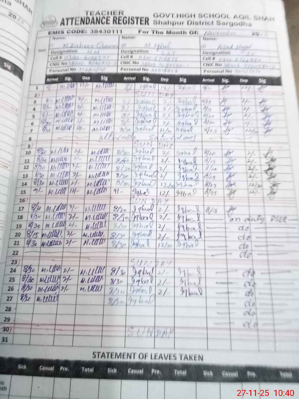 | CNIC | Full Name | Designation | R/C | Absence during last cal. month |
