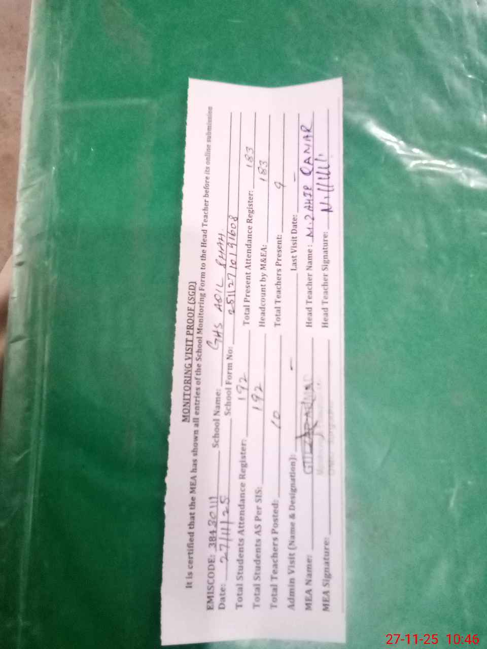 | Attendance Register | Head Teacher | MEA with School | Visit Proof |