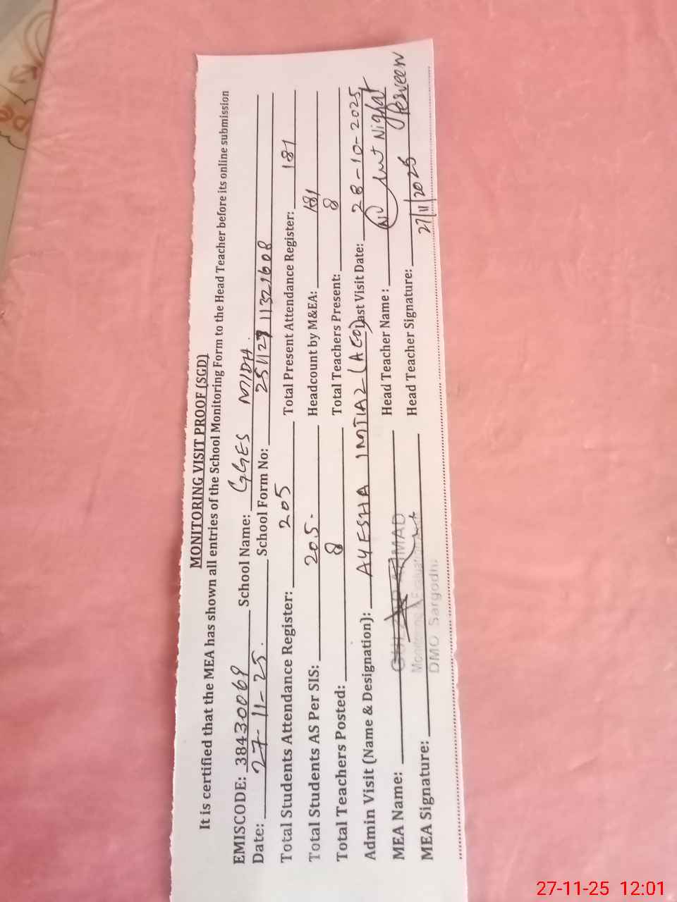 | Attendance Register | Head Teacher | MEA with School | Visit Proof |