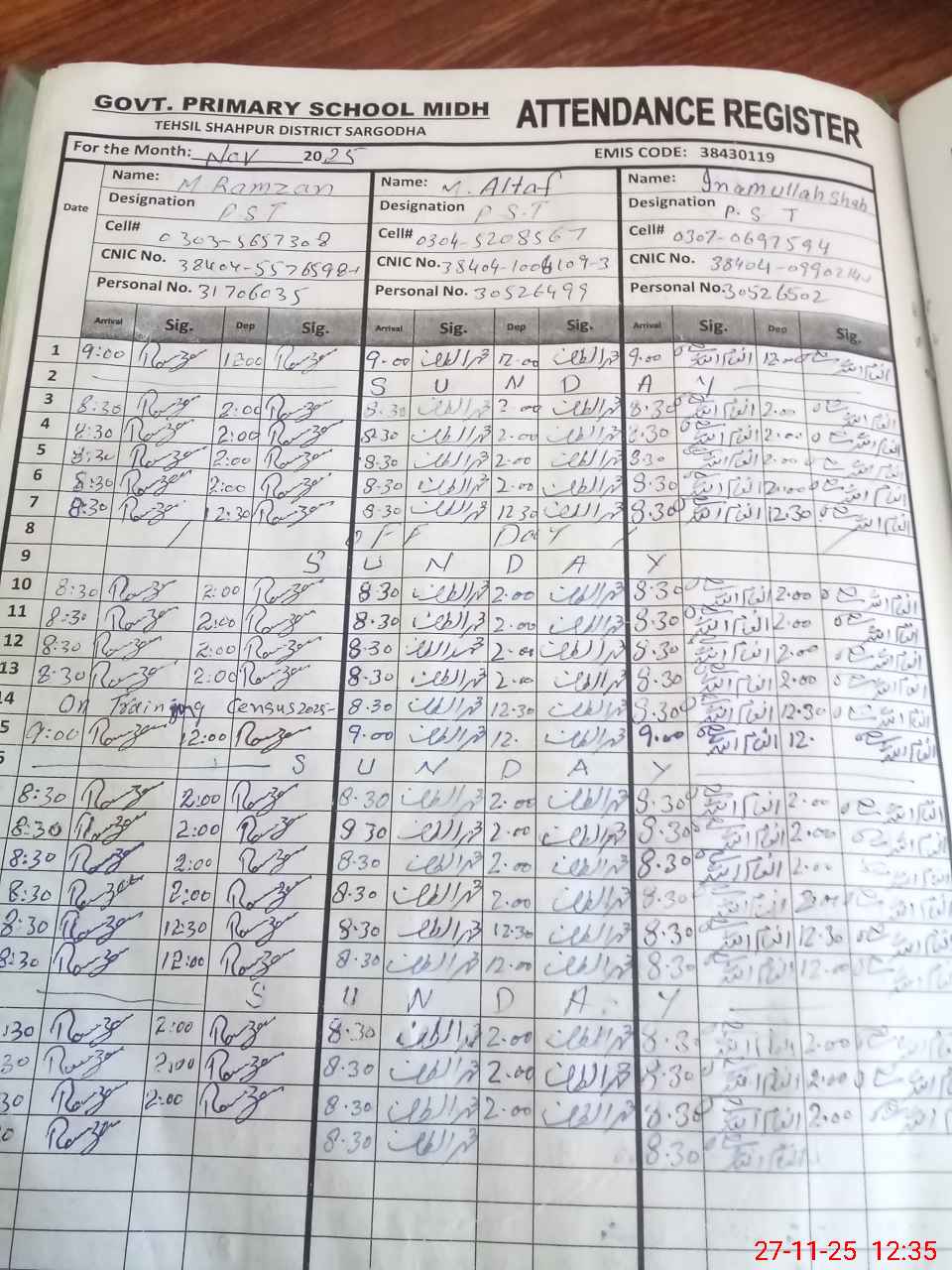 | CNIC | Full Name | Designation | R/C | Absence during last cal. month |