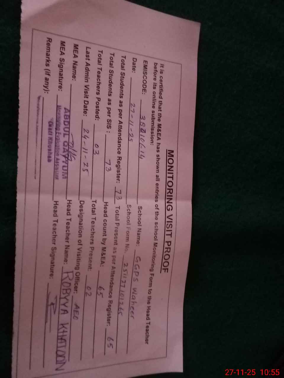 | Attendance Register | Head Teacher | MEA with School | Visit Proof |
