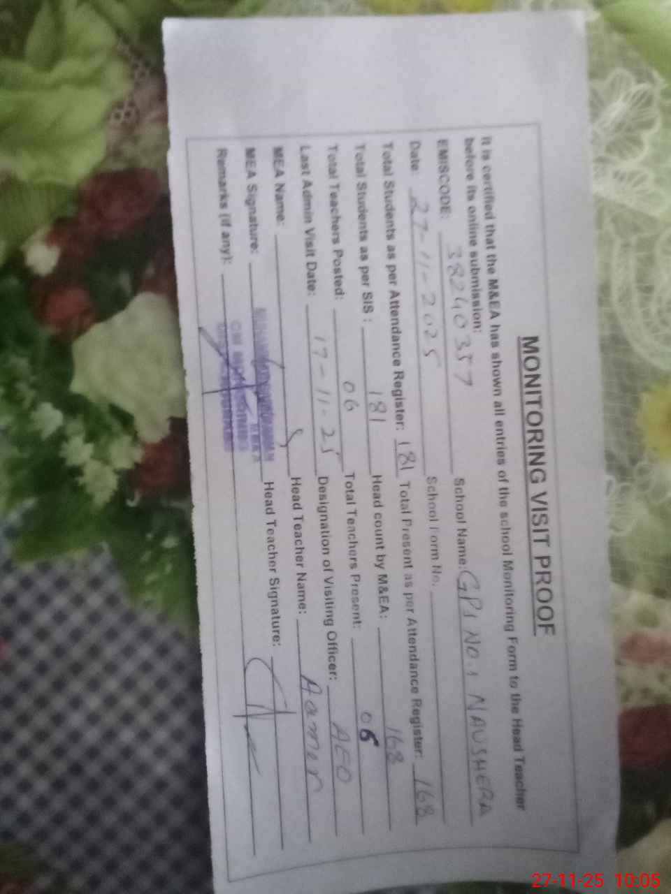 | Remarks (Use Separate Page if Required): Students on SIS QTY 181 Last admin visit On 17 November 2025 by AEO | |||||