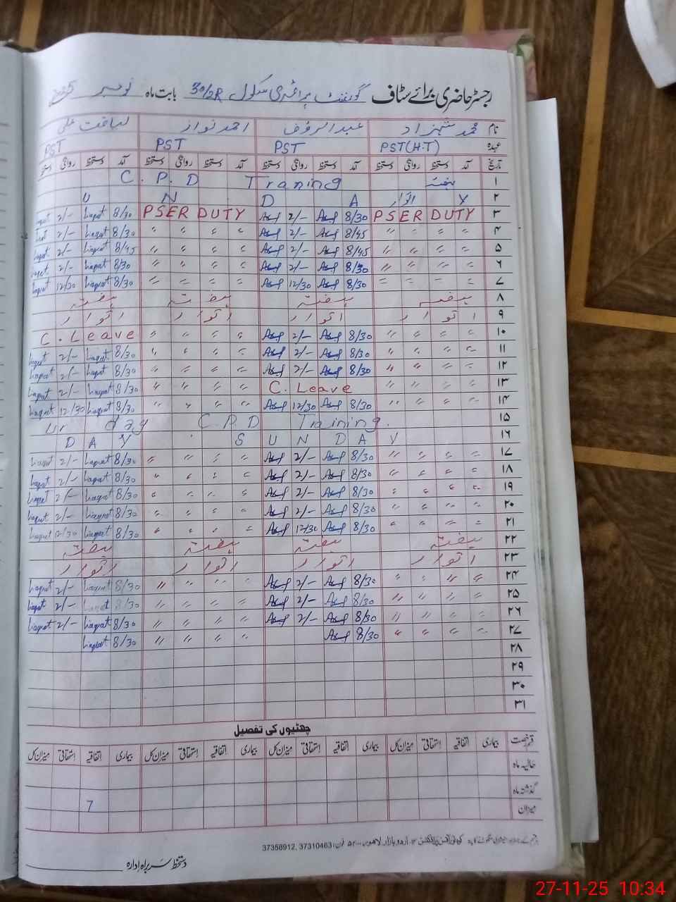 | CNIC | Full Name | Designation | R/C | Absence During Last Calender Month |