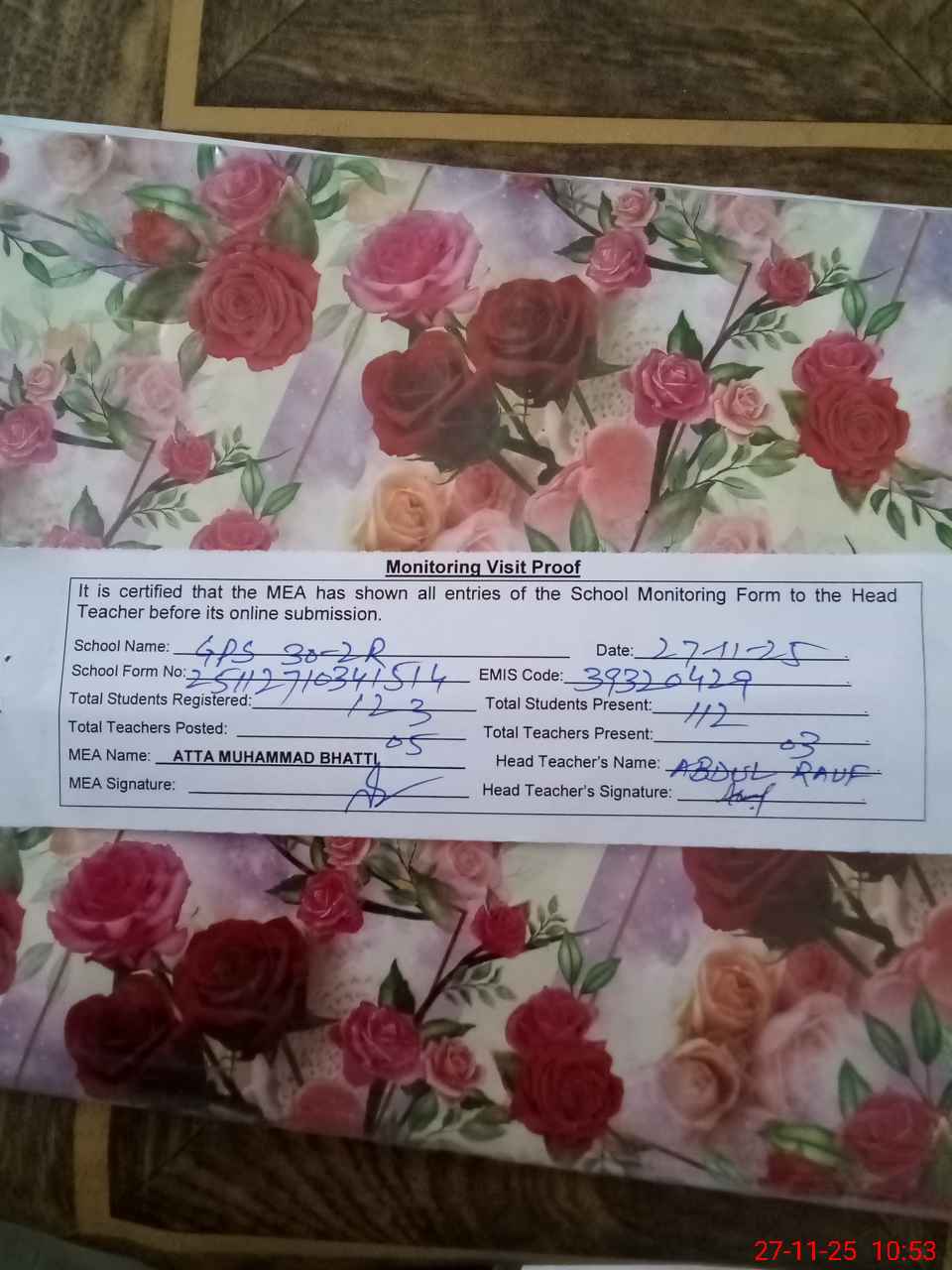 | Attendance Register | Head Teacher | MEA with School | Visit Proof |