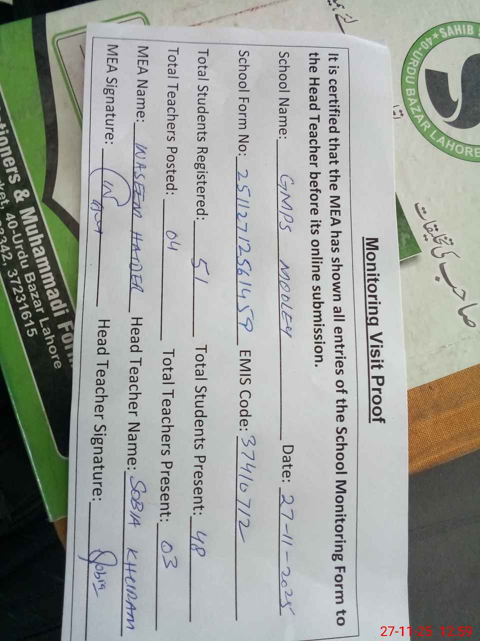 | Attendance Register | Head Teacher | MEA with School | Visit Proof |