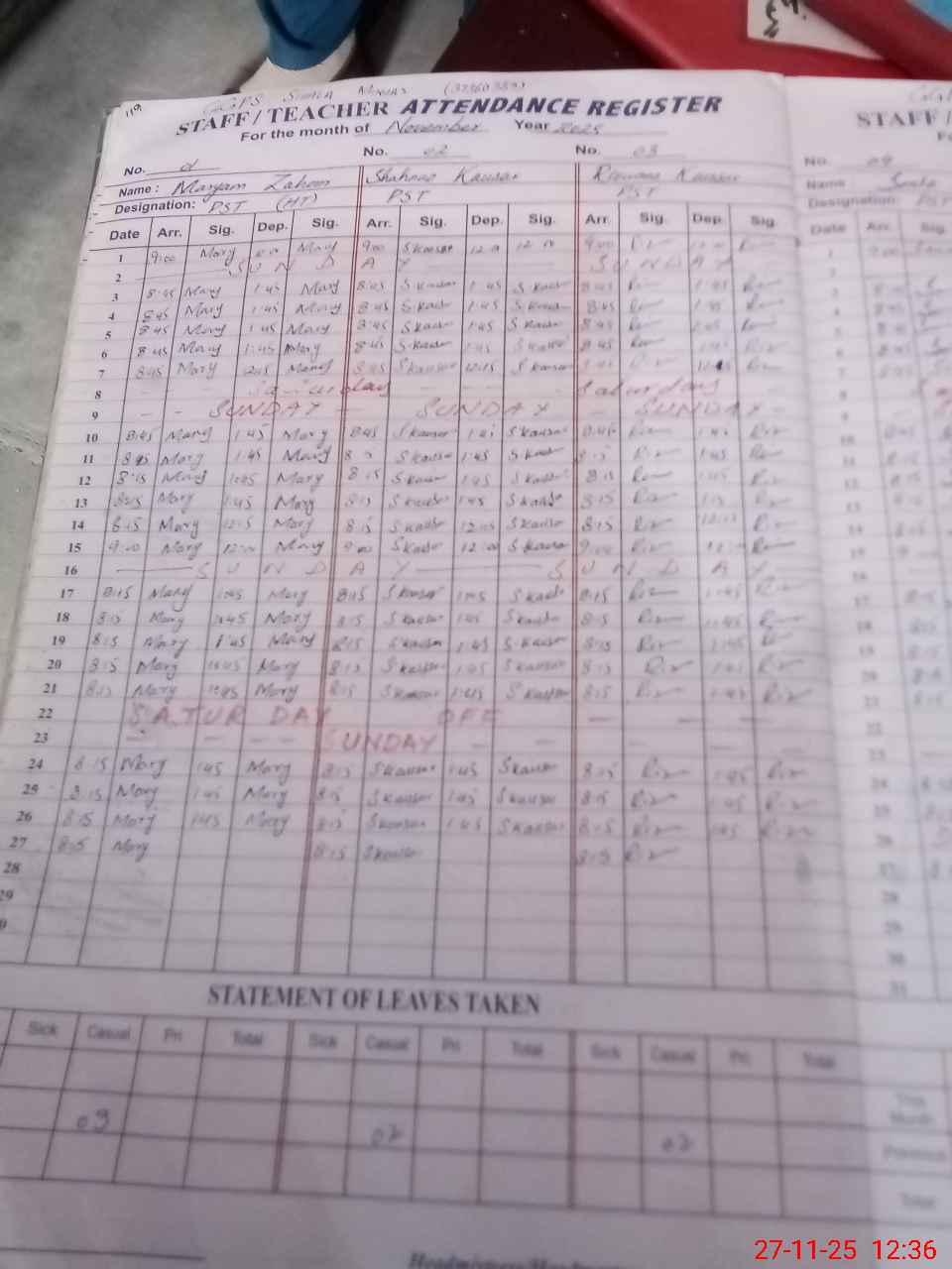 | Leave | Duty | Absent | Maternity | Medical | Ex- Pak |