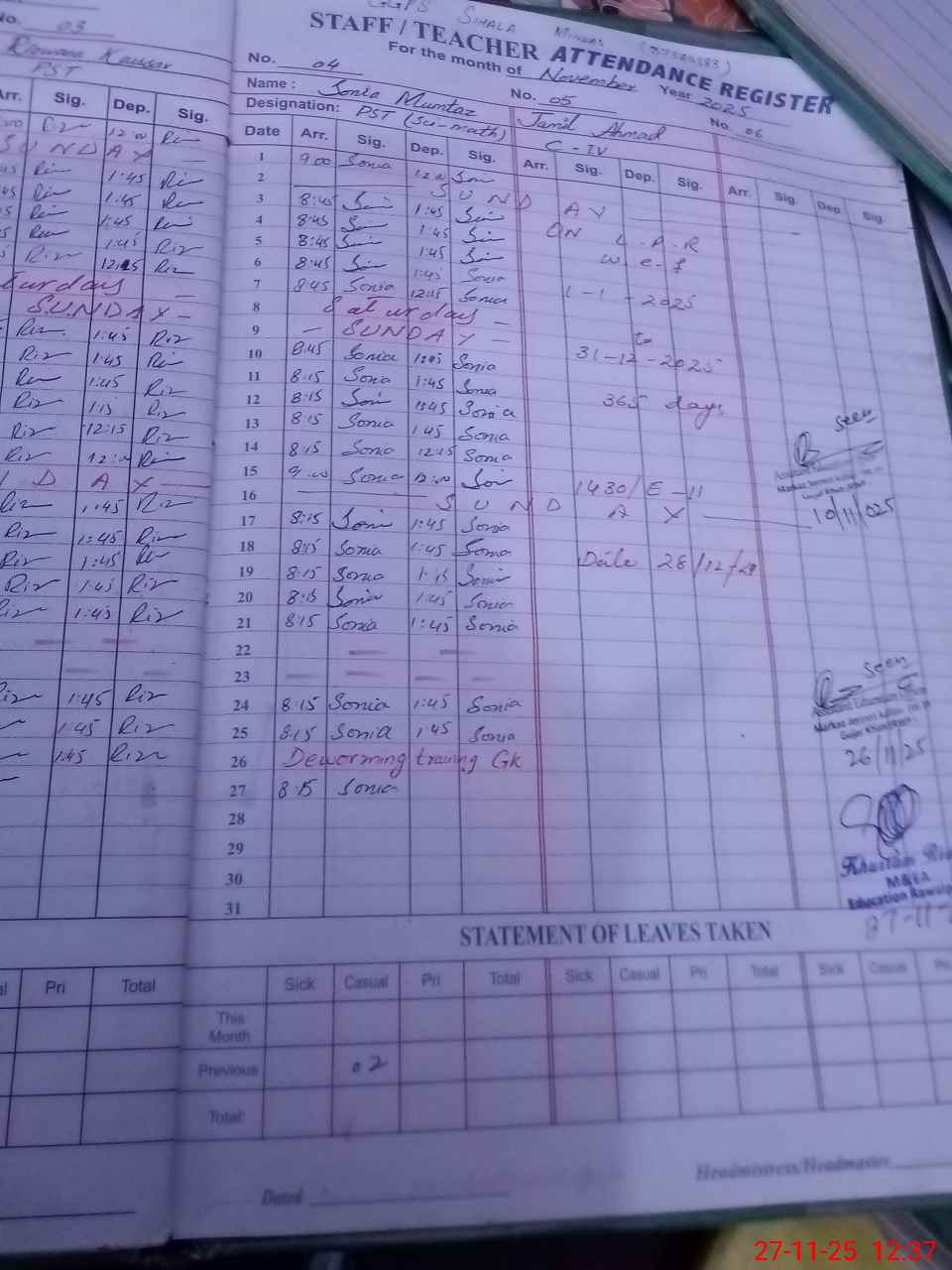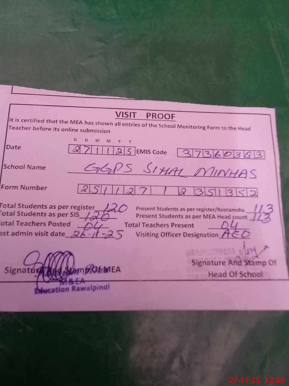 | Attendance Register | Head Teacher | MEA with School | Visit Proof |
